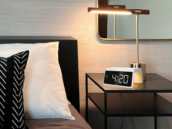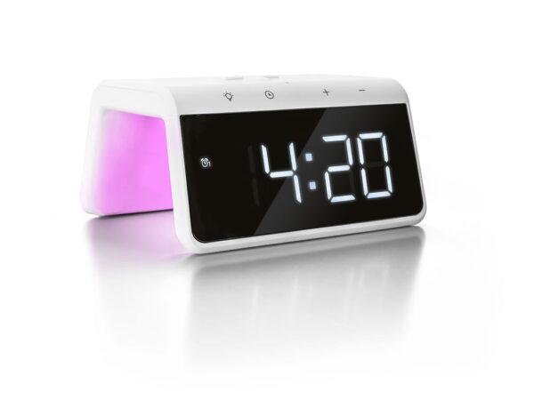 Onder de boog van deze wekker zit een nachtlampje dat kan schijnen in verschillende kleuren. Van normaal wit licht tot disco paars: je past de lichtkleur gemakkelijk aan. Daarnaast zitten er een ook wake-up light en een automatische dimfunctie op de wekker met draadloze oplader. Zo wordt het witte display automatisch minder fel richting middernacht en is de helderheid juist hoog om 7 uur ‘s ochtends. Word je ‘s nachts wakker en wil je de tijd goed kunnen zien? Dan kun je het display gemakkelijk feller zetten.